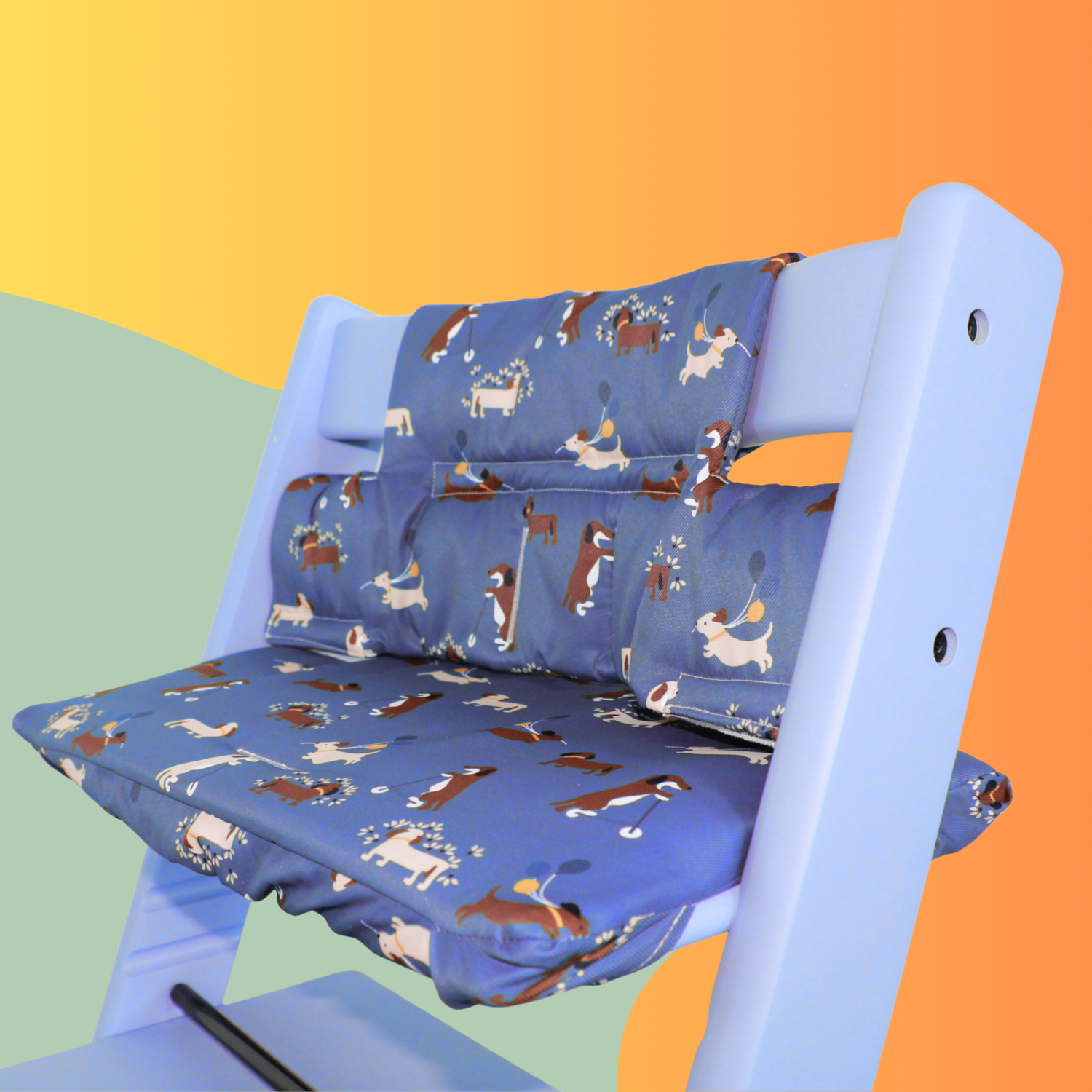 A high quality, custom-made highchair cushion set, suitable for use with the Stokke Tripp Trapp Highchair. The set consists of two pieces - a seat pad and back cushion.